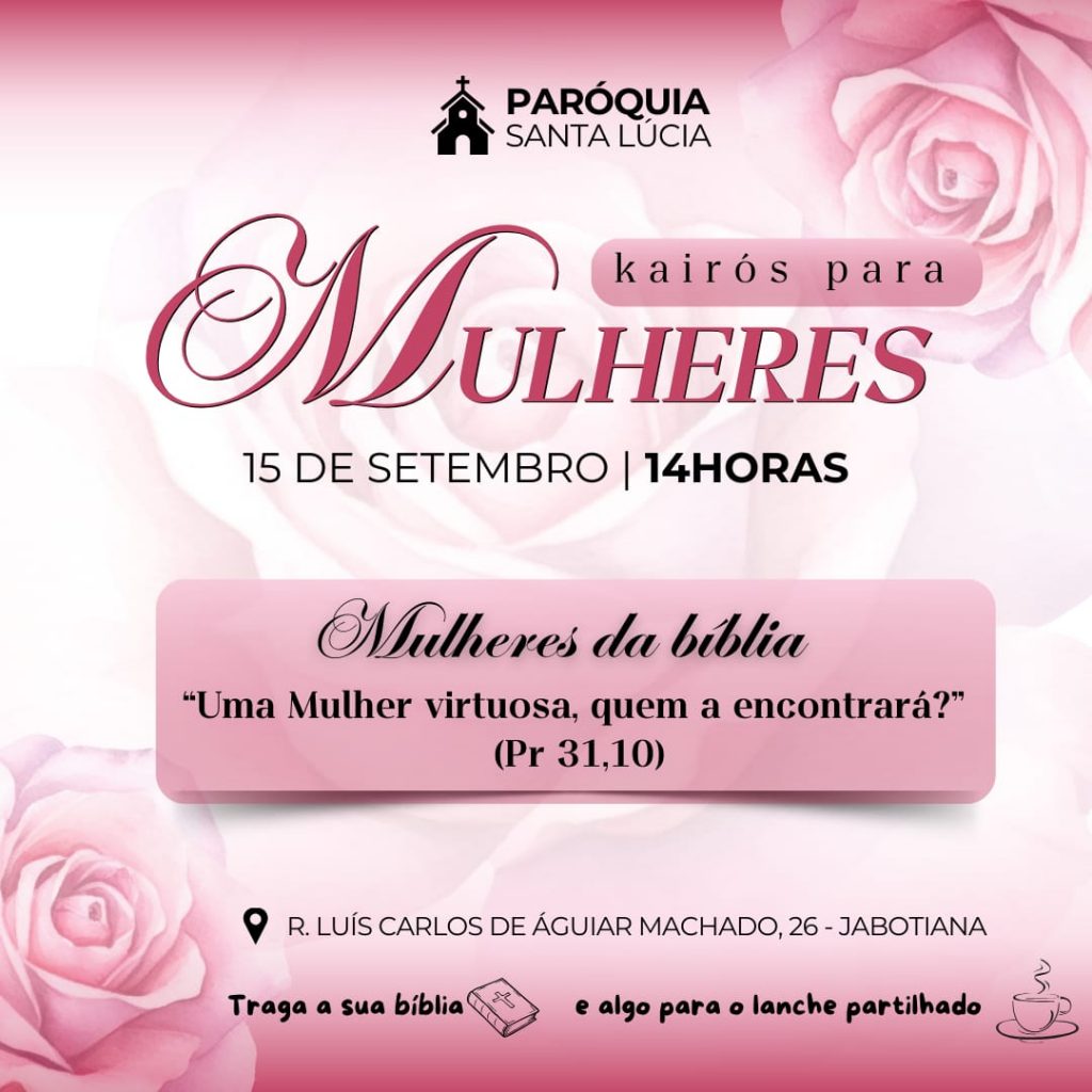 Venha participar do KAIRÓS PARA MULHERES: Uma tarde muito especial com louvor, oração, pregação e testemunho, encerrando com um lanche partilhado e a Santa Missa dominical das 17h.